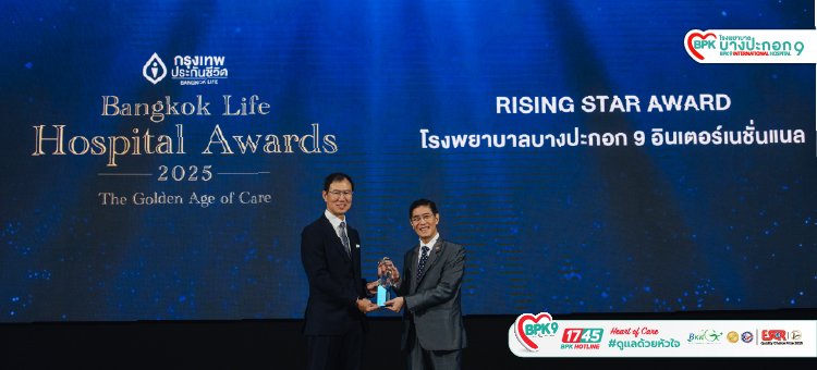 โรงพยาบาลบางปะกอก 9 อินเตอร์เนชั่นแนล (BPK9) ได้รับรางวัลพิเศษ "Bangkok Life Rising Star Award" เพื่อขอบคุณและเชิดชูเกียรติแก่โรงพยาบาลพันธมิตรที่ส่งมอบความใส่ใจอย่างต่อเนื่อง มีผลงานโดดเด่นในการให้บริการทางการแพทย์และการประสานงานด้านประกันสุขภาพอย่างมีประสิทธิภาพตลอดจนการส่งเสริมคุณภาพบริการเพื่อประโยชน์สูงสุดแก่ลูกค้าของ บริษัท กรุงเทพประกันชีวิต จำกัด
