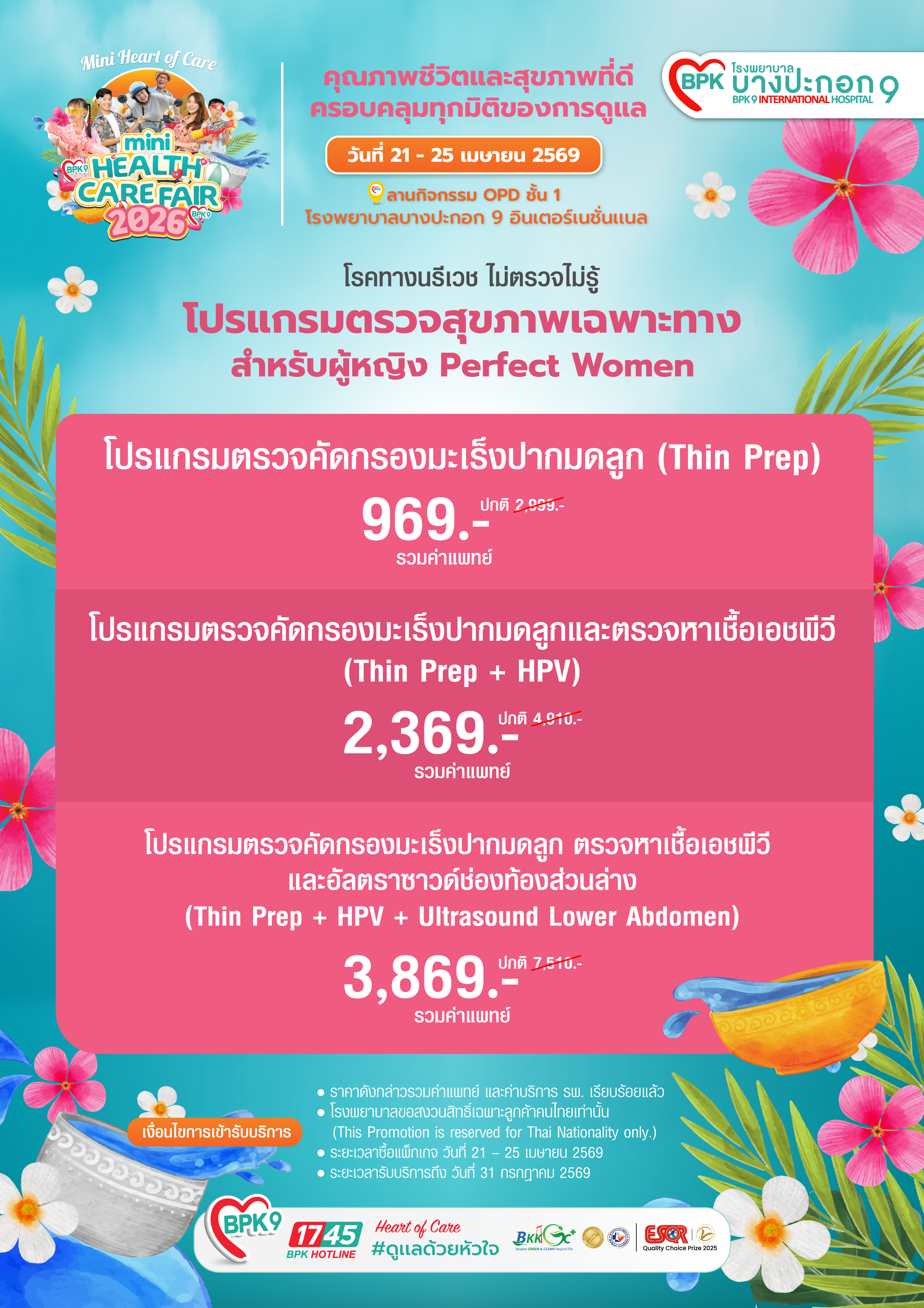HCF โปรแกรมตรวจคัดกรองมะเร็งปากมดลูกและหาเชื้อเอชพีวี พร้อมตรวจอัลตราซาวด์ช่องท้องส่วนล่าง Thin Prep + HPV + U/S Lower Abdomen