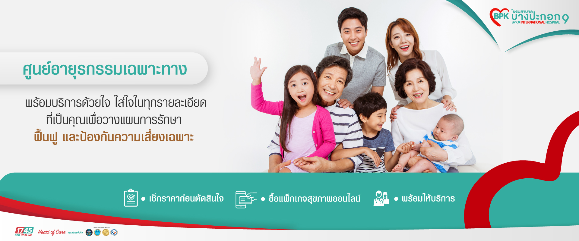 ศูนย์บริการผู้ป่วยรักษาโรคเฉพาะทาง ด้วยทีมแพทย์ที่เชี่ยวชาญ ตามมาตรฐานการดูแลรักษาอย่างมืออาชีพ พร้อมบริการด้วยใจ ความเอื้ออาทรใส่ใจดุจญาติมิตร จากทีมพยาบาลที่ได้รับการอบรมตามมาตรฐานวิชาชีพ เพื่อความปลอดภัยของท่าน และคนที่ท่านรัก เราใส่ใจสุขภาพของคุณประดุจญาติสนิทของเรา เพราะการเจ็บป่วยในโรคเดียวกันอาจจะไม่เหมือนกัน เราจึงใส่ใจในทุกรายละเอียดที่เป็นคุณเพื่อวางแผนการรักษา ฟื้นฟู และป้องกันความเสี่ยงเฉพาะของคุณ เราพร้อมด้วยทีมสหสาขาที่มีความเชี่ยวชาญ ประกอบกับเครื่องมือที่ทันสมัย
