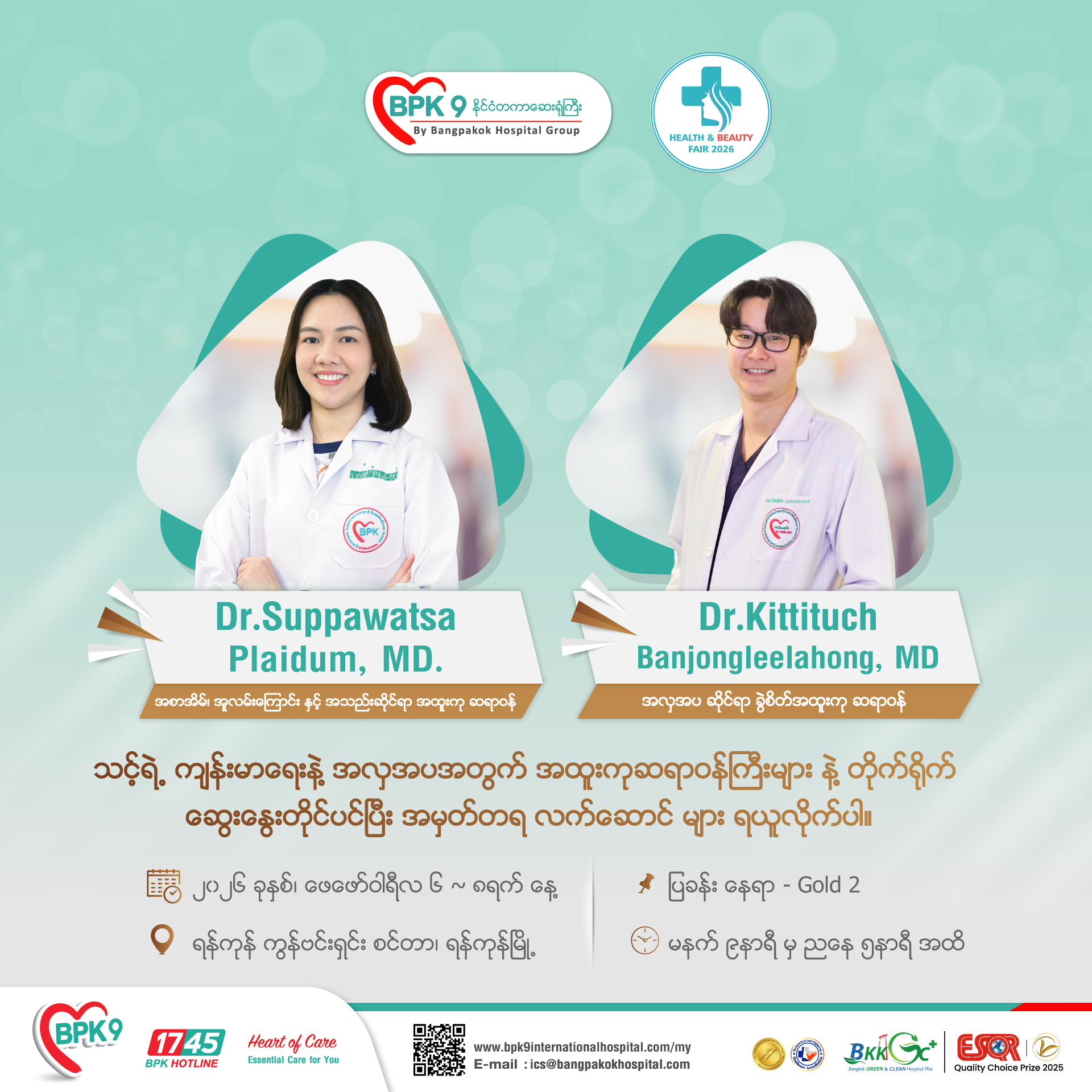 သတင်းကောင်း! ၂၀၂၆ ခုနှစ်၊ ဖေဖော်ဝါရီလတွင် ကျင်းပမည့် HEALTH & BEAUTY FAIR ပွဲကြီးတွင် BPK9 နိုင်ငံတကာဆေးရုံကြီးနှင့်အတူ လူကိုယ်တိုင် တွေ့ဆုံနိုင်ပါပြီ။