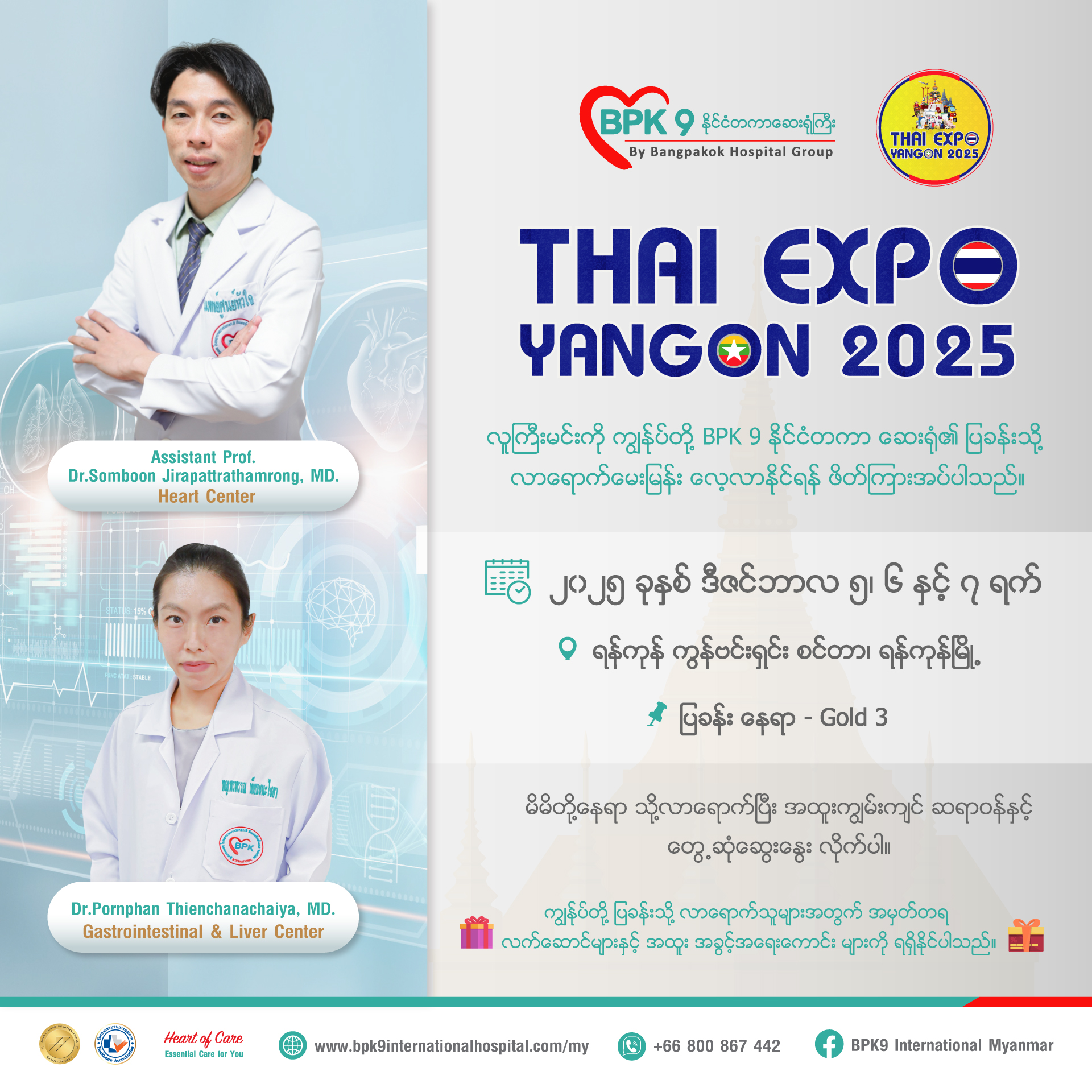 ၂၀၂၅ ခုနှစ် ဒီဇင်ဘာ ၅၊ ၆၊ ၇ ရက် တွင် Yangon Convention Center တွင်ကျင်းပသော THAI EXPO YANGON 2025 ပွဲ၌ BPK9 International Hospital သည် Gold Sponsor အဖြစ် ပါဝင်မှာ ဖြစ်ပါတယ်