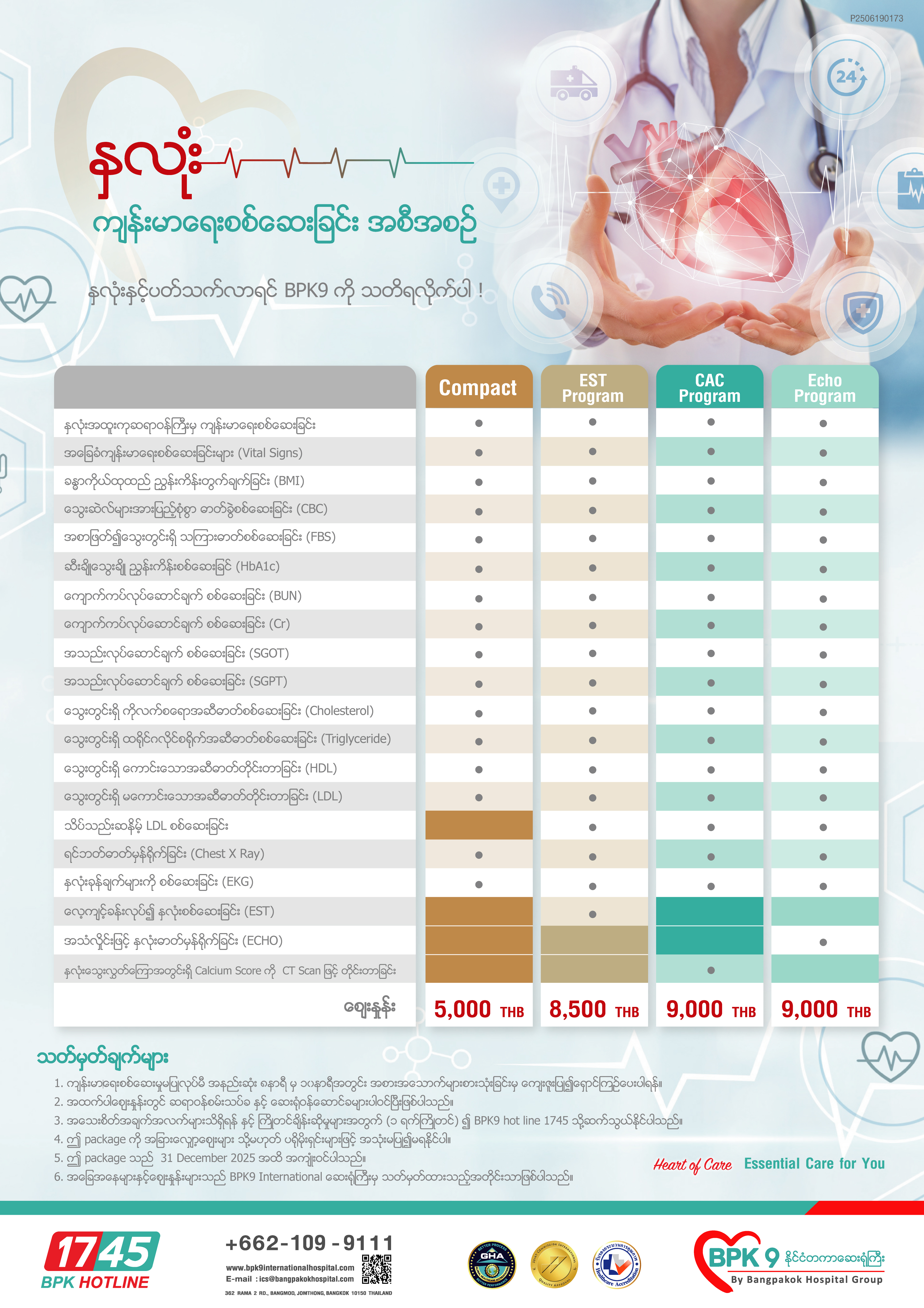 BPK9 International Hospital မှာ သင့် ကျန်းမာရေး အခြေအနေအတိုင်း ရွေးချယ်နိုင်တဲ့ Heart Check-Up Programs ၄ မျိုးရှိပါတယ်